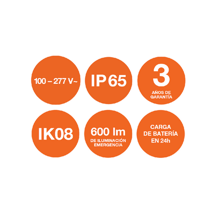 Protección: IP65 (hermética al polvo y al agua) / IK08 (alta resistencia a impactos)