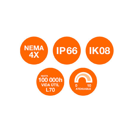 Gracias a su fabricación en policarbonato de alta resistencia, esta luminaria brinda protección contra impactos mecánicos (IK08), así como contra polvo, agua y agentes corrosivos, al contar con grado de protección IP66 y NEMA4X. Esto la convierte en una solución resistente para entornos industriales y exigentes.