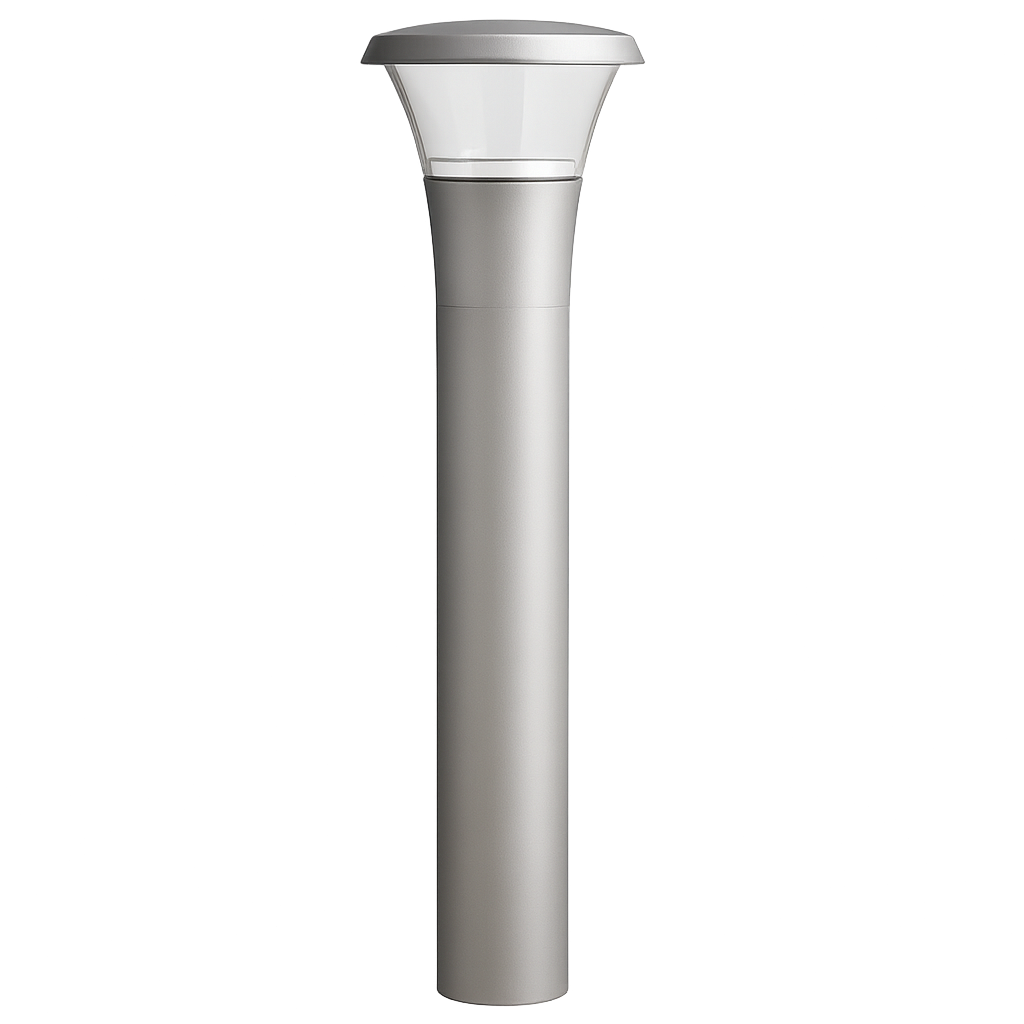 Miniposte Corvus de Construlita, diseñado para aplicaciones urbanas como parques, plazas, ciclovías y áreas peatonales. Este luminario de 1 m de altura ofrece un diseño estilizado con una fuente luminosa dispuesta en la base, que proyecta luz mediante una pantalla reflectiva especial, logrando una iluminación suave, uniforme y de alto confort visual. Su construcción hermética evita la condensación interna y la pantalla de alta transmisión es resistente a los rayos UV, garantizando durabilidad y rendimiento confiable.