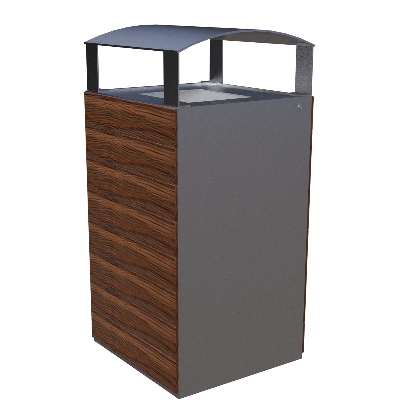 La estructura está fabricada en acero galvanizado con recubrimiento en pintura poliéster horneada, lo que proporciona alta resistencia a la intemperie, la humedad y los rayos UV. Los paneles laterales de plastimadera tipo nogal aportan una apariencia natural que simula la textura de la madera sin requerir mantenimiento, siendo resistente al desgaste y a la decoloración.