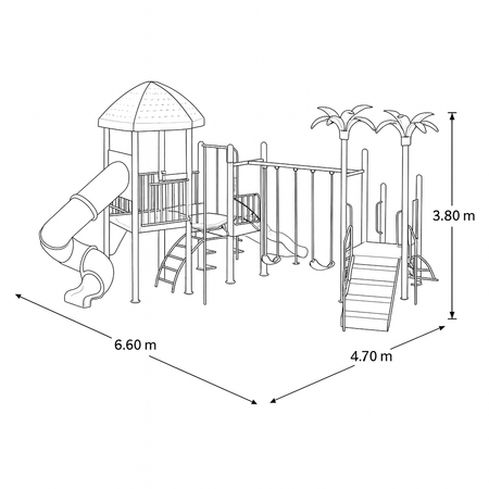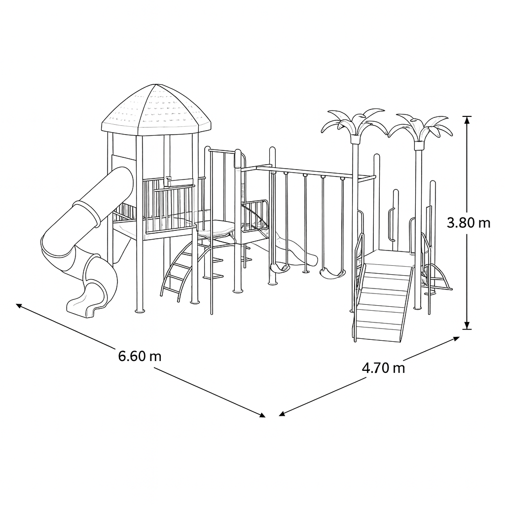 Cuenta con toboganes múltiples, plataformas interconectadas, escaleras, túneles y adornos con forma de palmeras, simulando un entorno natural tipo selva. Este modelo está pensado para garantizar seguridad, estabilidad y resistencia al uso constante y las condiciones climáticas exteriores.