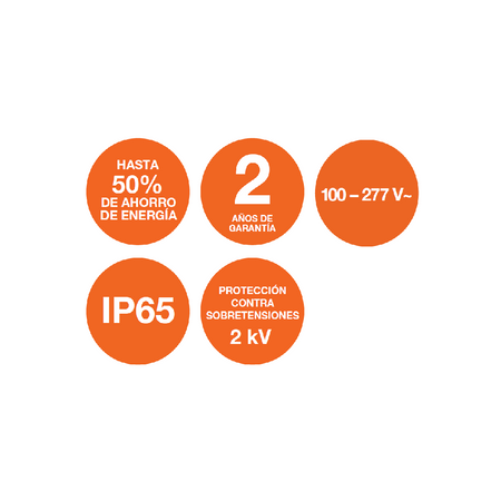 Esta luminaria de alta eficiencia y bajo consumo incluye driver integrado, lo que simplifica el montaje y garantiza un rendimiento estable en condiciones exigentes. Gracias a su cuerpo hermético y su fabricación en materiales resistentes, cuenta con protección IP65 y resistencia a sobretensiones de 2 kV, lo que la hace ideal para estacionamientos, hangares, salas frías, áreas industriales y zonas con vapor como saunas.