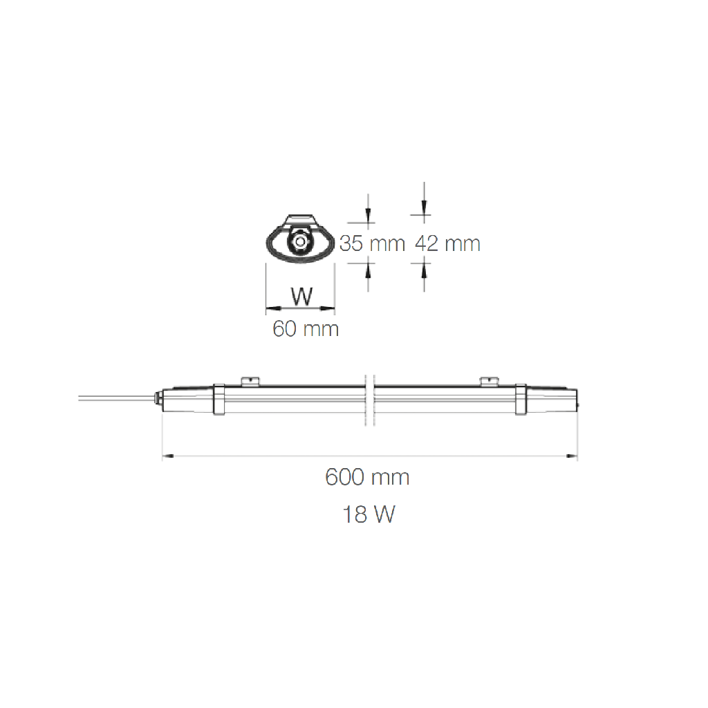 18 W, 1,980 lm, 600 x 60 x 35 mm, equivalente a 2x14 T5 o 2x17 T8.