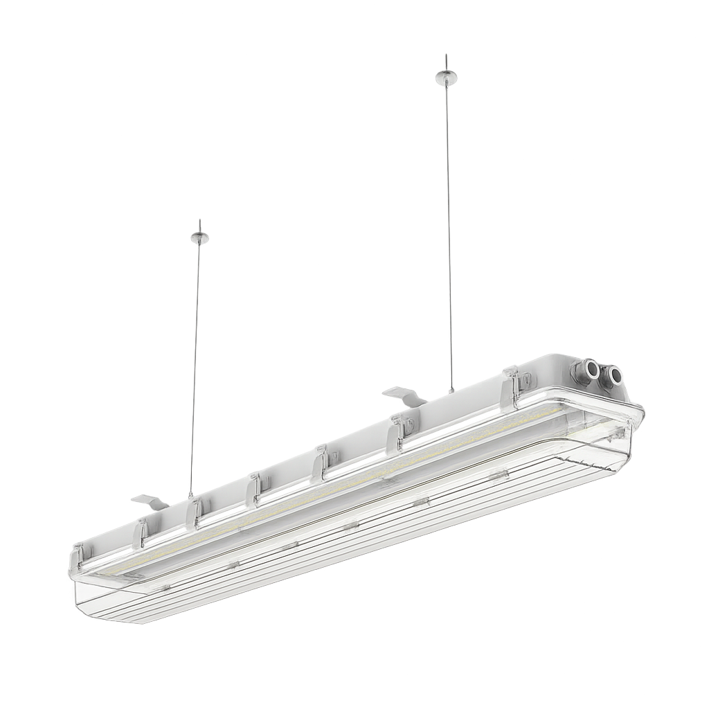Luminaria LED especialmente diseñada para zonas clasificadas, fabricada con estructura de acero inoxidable y difusor de policarbonato de alta densidad, lo que la hace ideal para montajes suspendidos o sobrepuestos de manera continua mediante tubería conduit. Su construcción robusta, combinada con la protección NEMA 4X, la certificación HazLoc UL – Class I, Division II, y su resistencia a la corrosión, garantiza una operación confiable en ambientes industriales con presencia de gases, vapores o sustancias químicas.