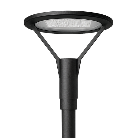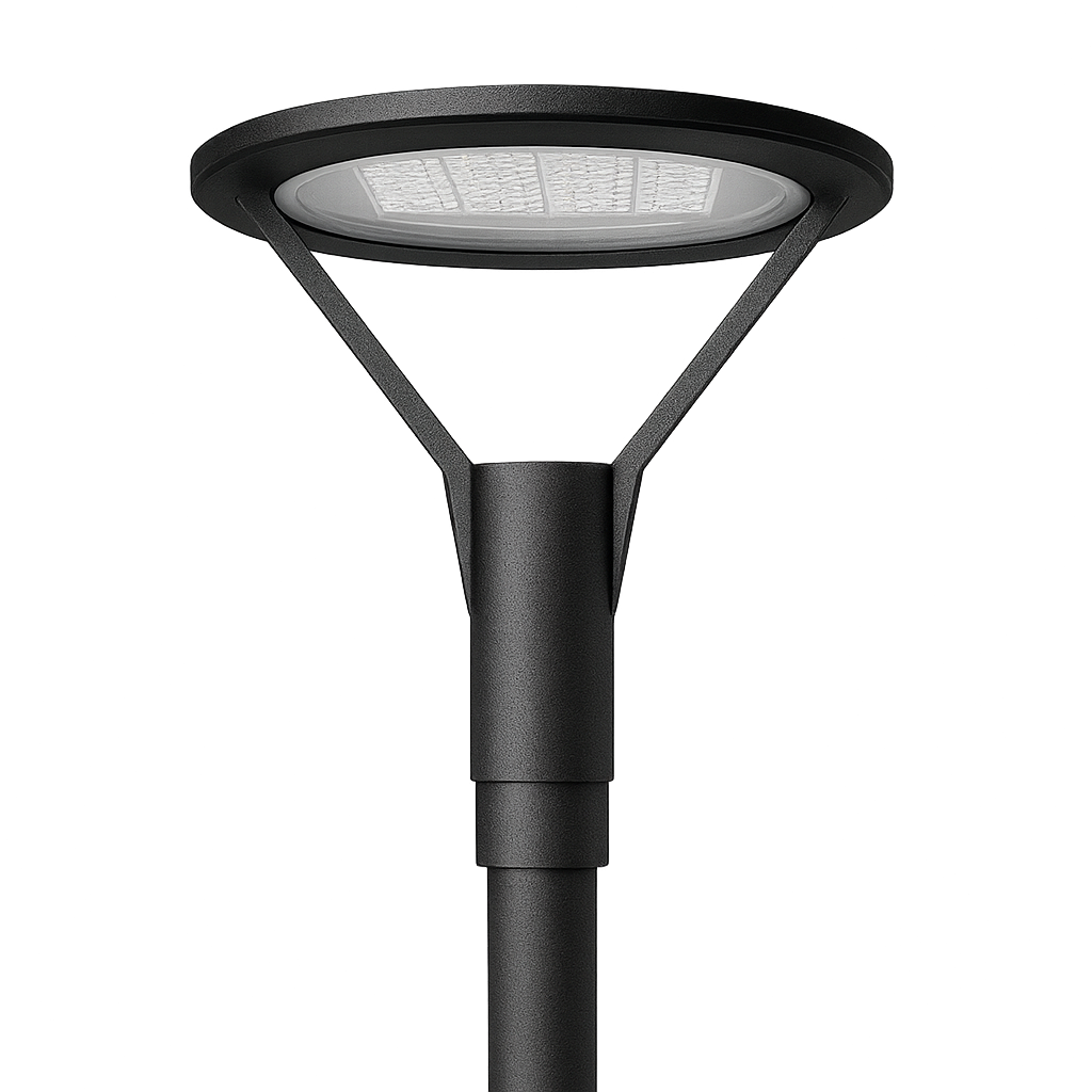 Su curvatura evita la acumulación de polvo y hojas, lo que reduce su mantenimiento y permite conservar su apariencia impecable con el tiempo. Con un diámetro de poste de 60–76 mm, se adapta fácilmente a diferentes entornos, aportando valor y estética a proyectos de iluminación exterior.
