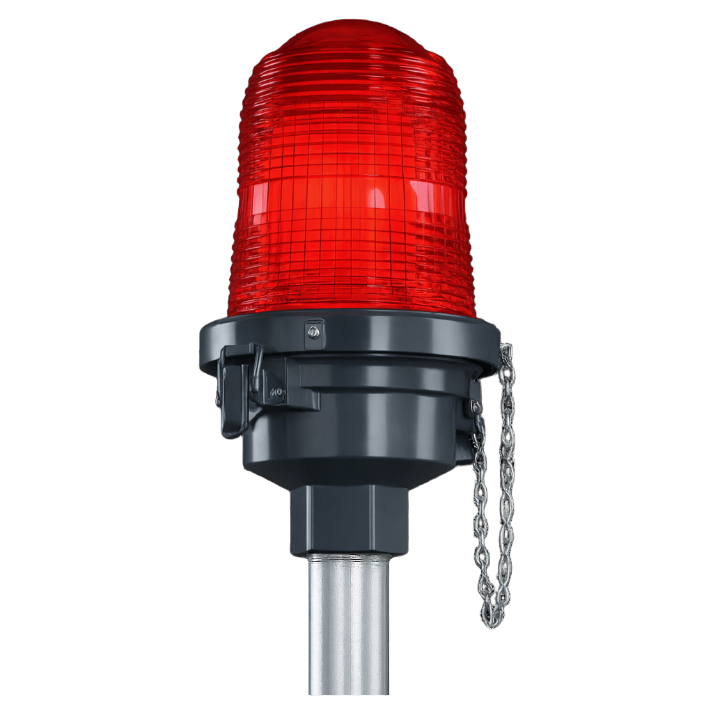 Fabricada con cuerpo de aluminio inyectado a presión tipo die cast, esta luminaria ofrece una estructura robusta y de alta resistencia mecánica, adecuada para aplicaciones en ambientes exteriores e interiores. El lente Fresnel de cristal proporciona visibilidad omnidireccional de 360°, permitiendo que la señal luminosa sea perceptible desde cualquier ángulo de aproximación, condición indispensable en aplicaciones de seguridad aérea.